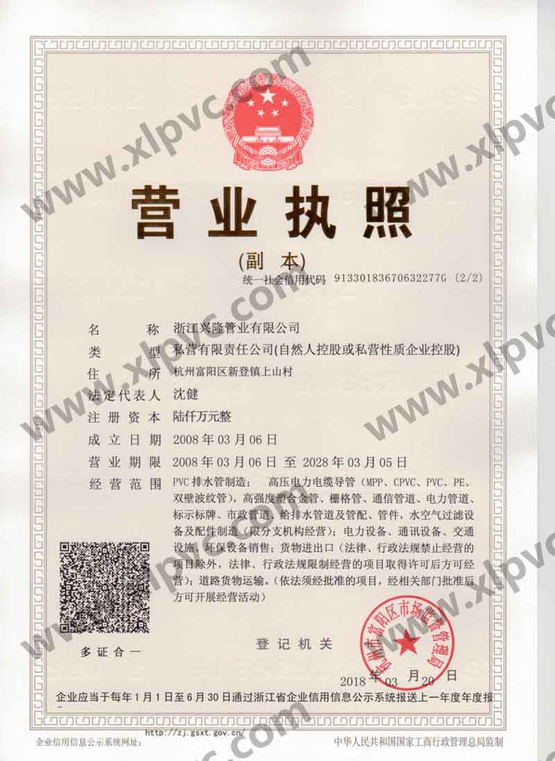 浙江興隆管業(yè)有限公司位于杭州市富陽區(qū)(杭州第九新區(qū)),坐落在新登鎮(zhèn),相距杭州僅60公里,水、陸、空交通運輸十分便利。浙江興隆管業(yè)有限公司前身為富陽興隆塑料制品廠,成立于1992年,2008年改名浙江興隆管業(yè)有限公司,數(shù)十年來,公司一直至力于管道的生產(chǎn),目前公司擁有國內(nèi)先進的CPVC保護管生產(chǎn)線,HPVC()雙壁波紋管生產(chǎn)線,多孔管生產(chǎn)線,玻璃鋼電纜保護管生產(chǎn)線、MPP電纜保護管生產(chǎn)線。生產(chǎn)的主要產(chǎn)品有:CPVC電纜保護管、MPP電力電纜保護管(頂管)、高強度塑合金管、HDPE給排水管、HPVC()雙壁波紋管、玻璃鋼電纜保護管、埋地通信用的PVC-U多孔管、PE直壁管、PVC-U雙壁波紋管、梅花管等,年生產(chǎn)能力達(dá)20000萬米。